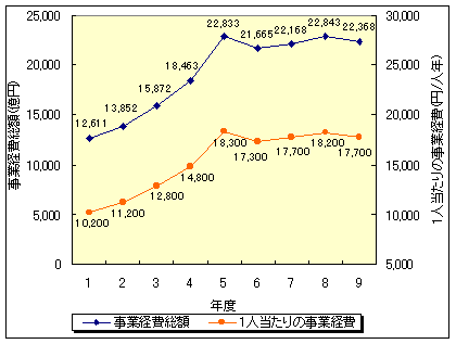 うち、ごみ処理事業経費については、2兆2,368億円(8年度2兆2,843億円)であり、国民1人当たりに換算すると、17,700円(8年度18,200円)となり、昨年度より若干減少している(図-10参照)。 |