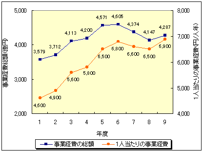 一方、し尿処理経費については、4,287億円(8年度4,147億円)となっており、し尿処理の対象人口(非水洗化人口及び浄化槽人口の合計)当たりに換算すると、6,900円(8年度6,500円)となっている(図-11参照)。 |