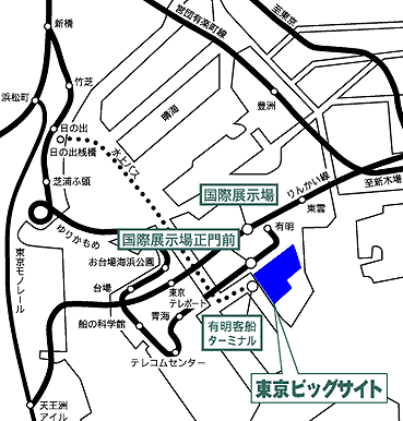 新木場駅(JR、営団地下鉄)←約5分→国際展示場駅(下車徒歩5分) 天王洲アイル駅(東京モノレール)←約5分→国際展示場駅(下車徒歩5分)