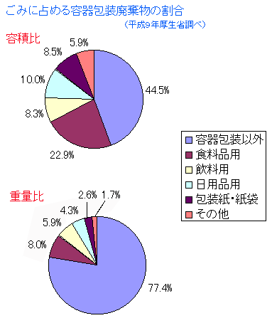 | 家庭ごみを中心とする一般廃棄物の中で、容器・包装廃棄物が占める割合は、容積比で6割、重量比で2割〜3割に達しています。ごみの減量化・リサイクルを推進していくには、これら容器・包装廃棄物への対策が不可欠になっています。 | ||
